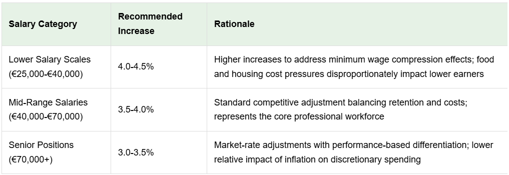 The recommended 3.0-4.0% salary increase range for 2026 provides a balanced approach that protects employee purchasing power against inflation, maintains competitive positioning in the Irish market, supports retention during continued talent market tightness, and remains financially sustainable during economic normalization.